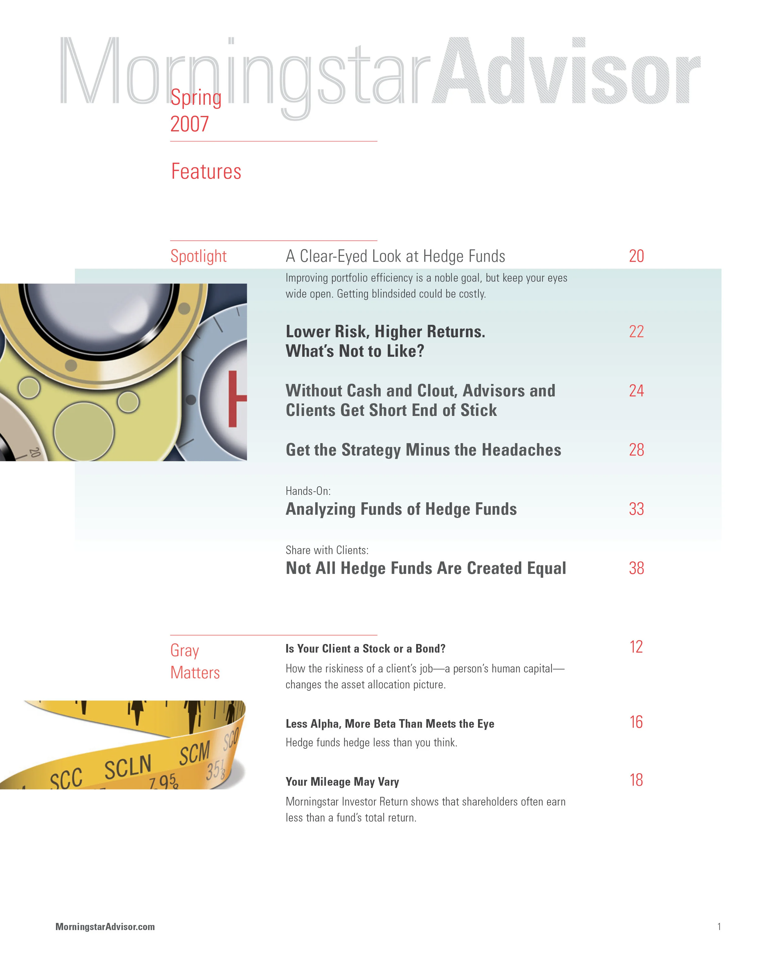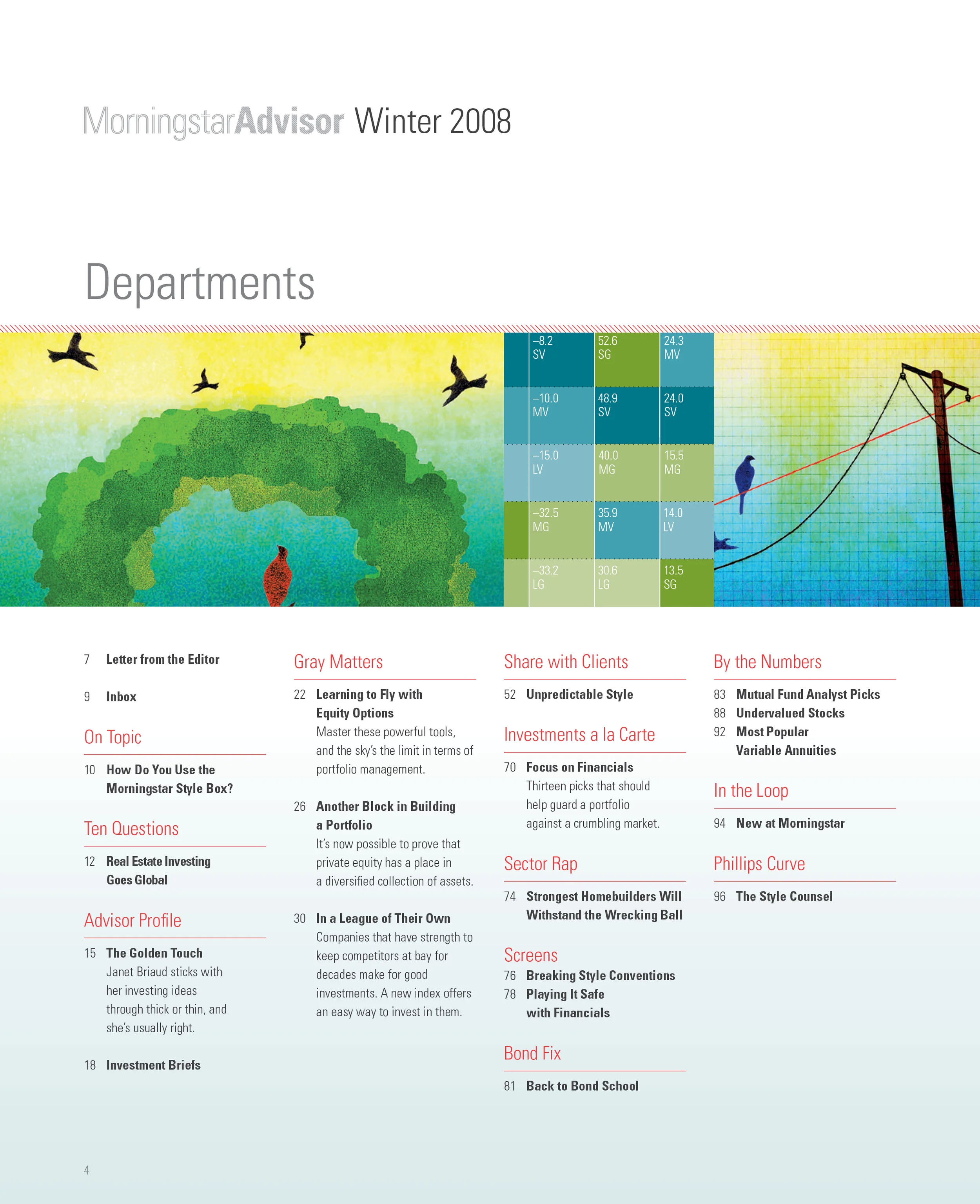 Morningstar Advisor magazine was launched in the spring of 2007 as Morningstar's first magazine for financial advisors. I was a member of the launch team, where I developed layouts, typographic standards, and an illustration strategy. I also drew the Morningstar Advisor title mast. After the magazine's launch, I became its associate art director. In 2011, I became its art director.