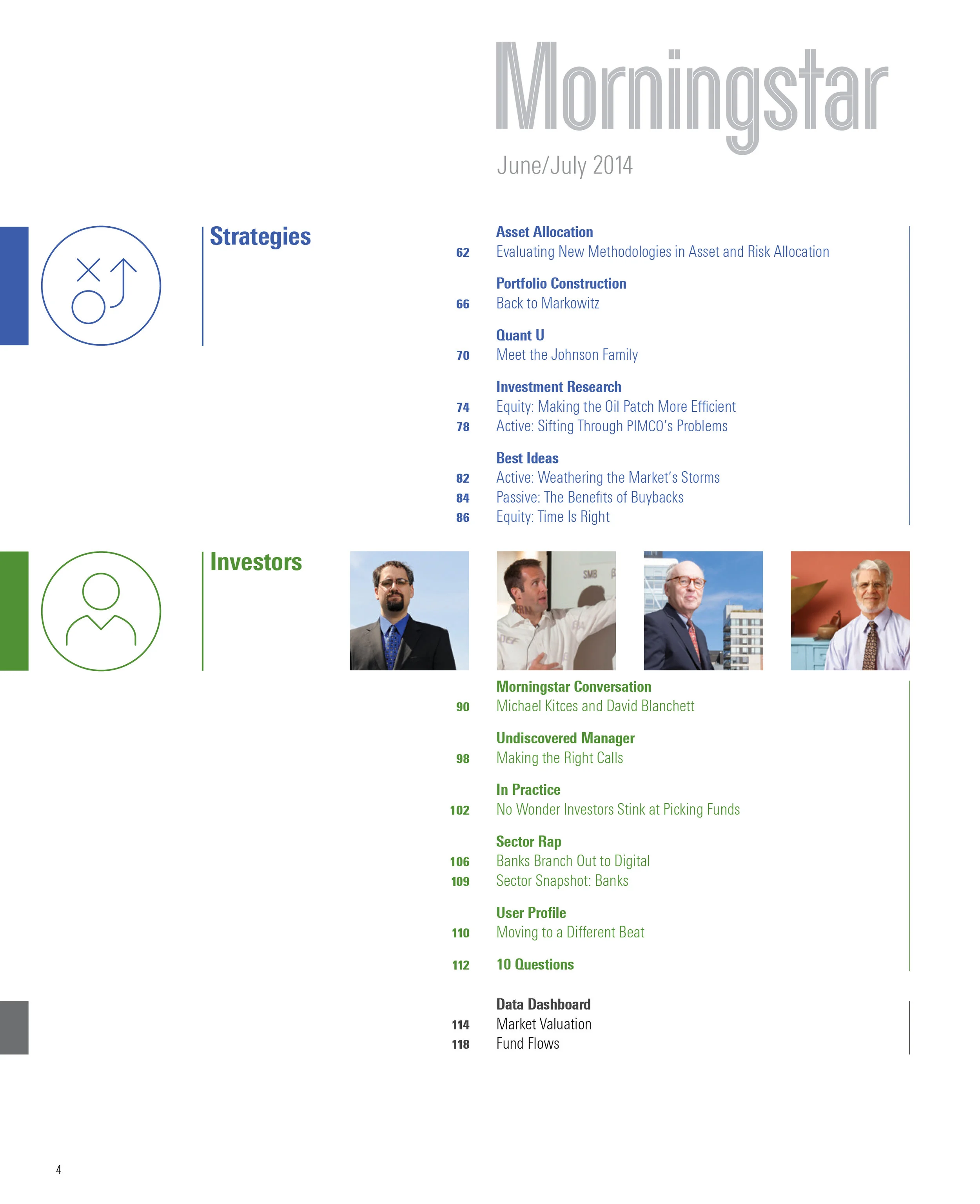 Morningstar magazine is the next evolution of Morningstar Advisor magazine. Its target audience expanded to include institutional investors from purely financial advisors. The entire publication was redesigned in 2014 to highlight this move. I worked closely with the editorial team to restructure and expand the magazine's content, and guided a team of designers in the redesign of the publication. In honor of the redesign, I drew custom characters for the new title mast. The June/July 2014 issue was the debut of the redesign.